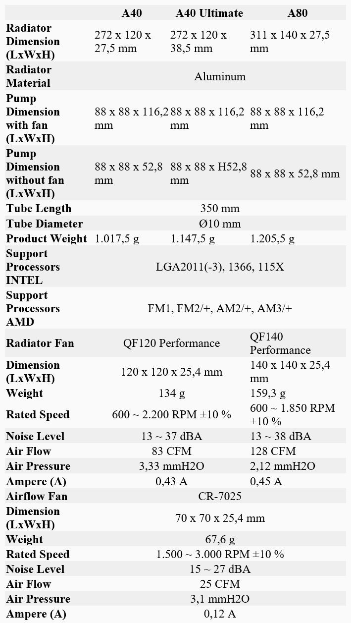 La serie di AIO Ibridi di CRYORIG si compone come visto nelle scorse news del modello A40 con radiatore da 240mm, del modello A40 Ultimate con stesso radiatore da 240mm ma più spesso e del modello A80 con radiatore da 280mm. Tutti i modelli sono dotati delle proprietarie ventole QF120 e QF140 PWM a seconda del modello e in unione alla CR-7025 con RPM variabili da 1500-3000 potremo controllare e regolare i giri di tutti e tre le ventole grazie alla funzione PWM delle stesse.