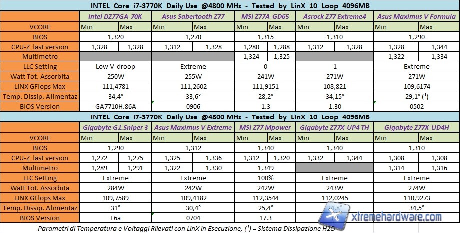 Grazie alla presenza di punti per la rilevazione delle tensioni in tempo reale, ci siamo avvalsi del noto tool CPU-Z per la rilevazione della frequenza del processore in tempo reale. Le misurazioni sono state prese con il sistema sotto carico tramite LinX utilizzando come riferimento la frequenza di 4800MHz (come per le altre schede) impostata da BIOS. Ovviamente per superare il test dei 10 cicli sotto LinX con il quantitativo di memoria di 4096MB ogni scheda ha richiesto da BIOS un determinato voltaggio. Al fine di rendere attendibile il test e porre le schede sullo stesso piano per verificarne la sezione di alimentazione e quindi la singola capacità di stabilizzare il Vcore erogato riducendo al minimo il Vdroop, siamo intervenuti sul LoadLineCalibration settandolo al massimo possibile. Il profilo LLC impostato su Extreme da bios sulla Z77X-UD4H ci ha permesso di rilevare un comportamento della scheda madre estremamente stabile dal punto delle tensioni sotto carico rilevando da Multimetro un Vdroop di soli 0,002 volt. Abbiamo comparato le schede rilevando le variazioni di tensione sotto carico, nonché il valore in GFlops di picco massimo generato per ognuna. Abbiamo inoltre misurato i consumi del sistema nella sua complessità per valutare l’efficienza delle fasi di alimentazione. Ricordiamo che l’importanza del circuito di alimentazione è direttamente proporzionale alla capacità computazionale espressa da LinX, poiché a determinate frequenze limite, il processore assorbe un notevole quantitativo di corrente e se la sezione di alimentazione della motherboard non riesce a far fronte alla richiesta di corrente, il valore computazionale di LinX rimane basso. Di solito su molte altre schede madri con una sezione di alimentazione non all’altezza, per cercare di chiudere il test ad una data frequenza, si aumenta il voltaggio (Vcore) applicato al processore, ma ci si scontra con il problema della temperatura. Di seguito la tabella riepilogativa dei risultati ottenuti: